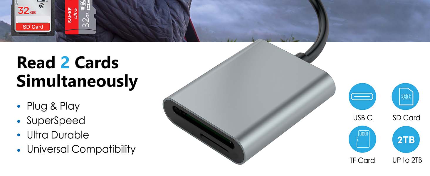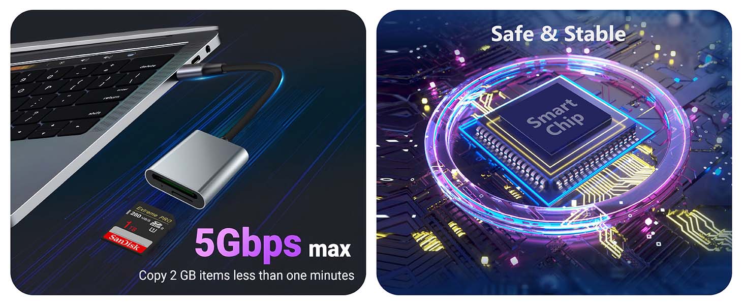【超高速数据传输】-集成设计的SAMKE USB-C/USB 3.0读卡器可高速访问2种不同的卡类型,SD(安全数字)和Micro SD(TF)。USB 3.0 SD卡读卡器为您带来计算机和存储卡之间5Gbps快速可靠的数据传输速度,USB C转SD/TF读卡器可以通过USB 3.0/2.0插槽或最新的USB Type-C(Thunderbolt 3兼容)插槽与计算机或笔记本电脑配合使用。