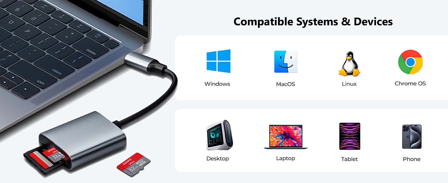 【通用兼容性】SAMKE USB C Micro SD卡适配器与iPhone 15/15 Pro/Pro Max、三星Galaxy S23/S22/S21/A54/A34/S10/Note 20、MacBook Pro/Air、Mac mini、iPad Pro 2023/2022/2021/2020/2018、iPad Air 5/4、OnePlus 11/11R/10R/Nord 3/等USB-C设备广泛兼容。