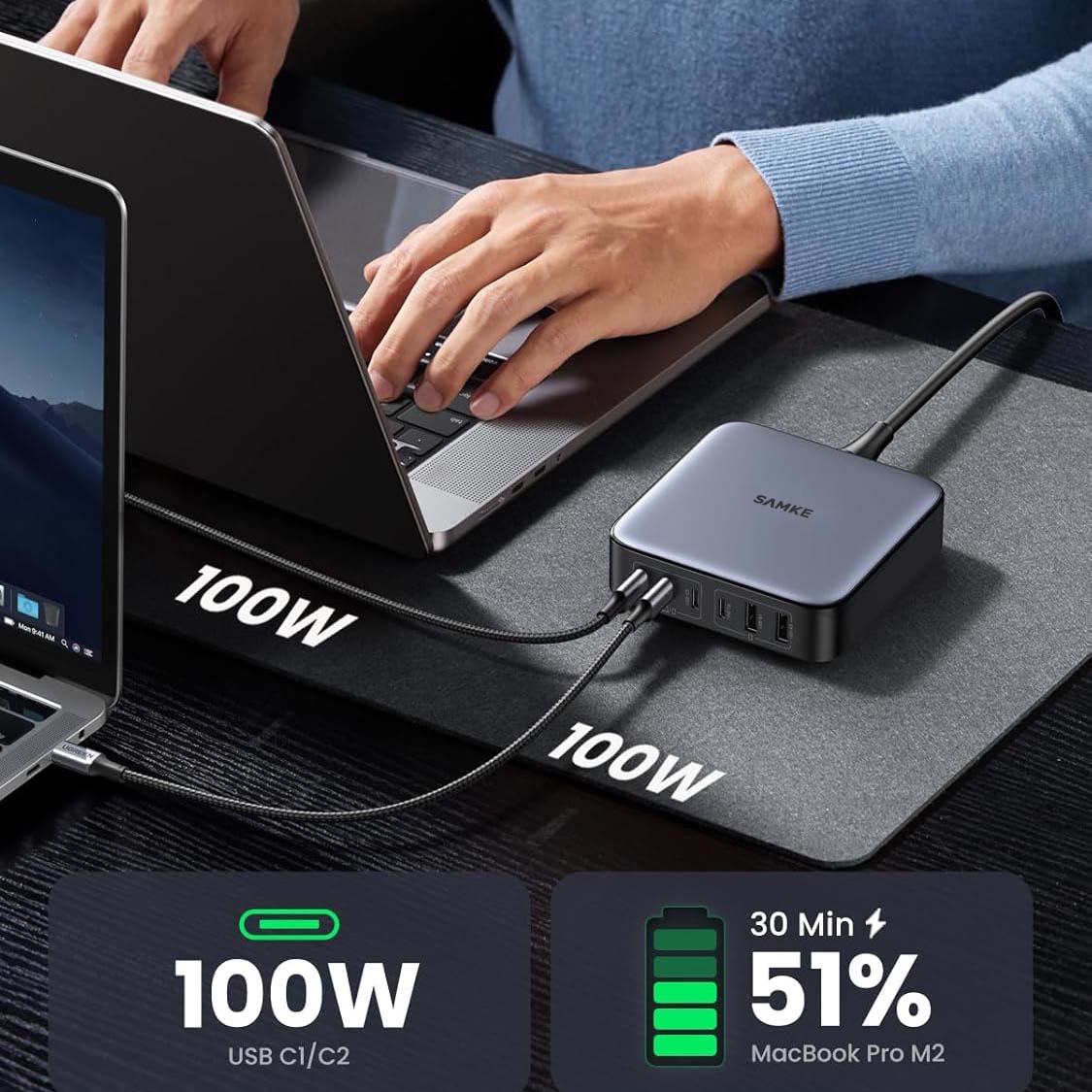 更多空间,更多自由:将所有设备都放在触手可及的地方,提高效率,整理电线丛林,节省更宝贵的办公空间,该包装配有3.3英尺的100W USB C电缆