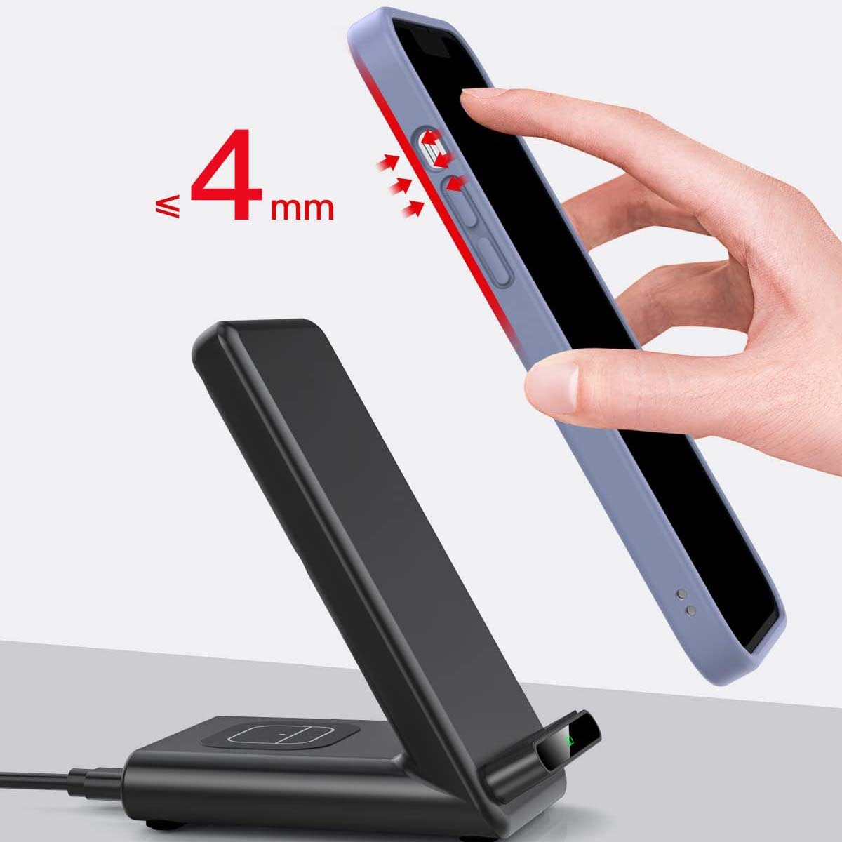 具有过流、过压、过温、短路保护和异物检测功能。配备防滑硅胶垫,充分保护您的设备在充电时免受划痕和滑落。此外,无线充电座可以与大多数长达4mm的手机壳一起使用,充电前无需拆下手机壳,但请拆下所有会干扰无线充电的金属或磁性附件。
