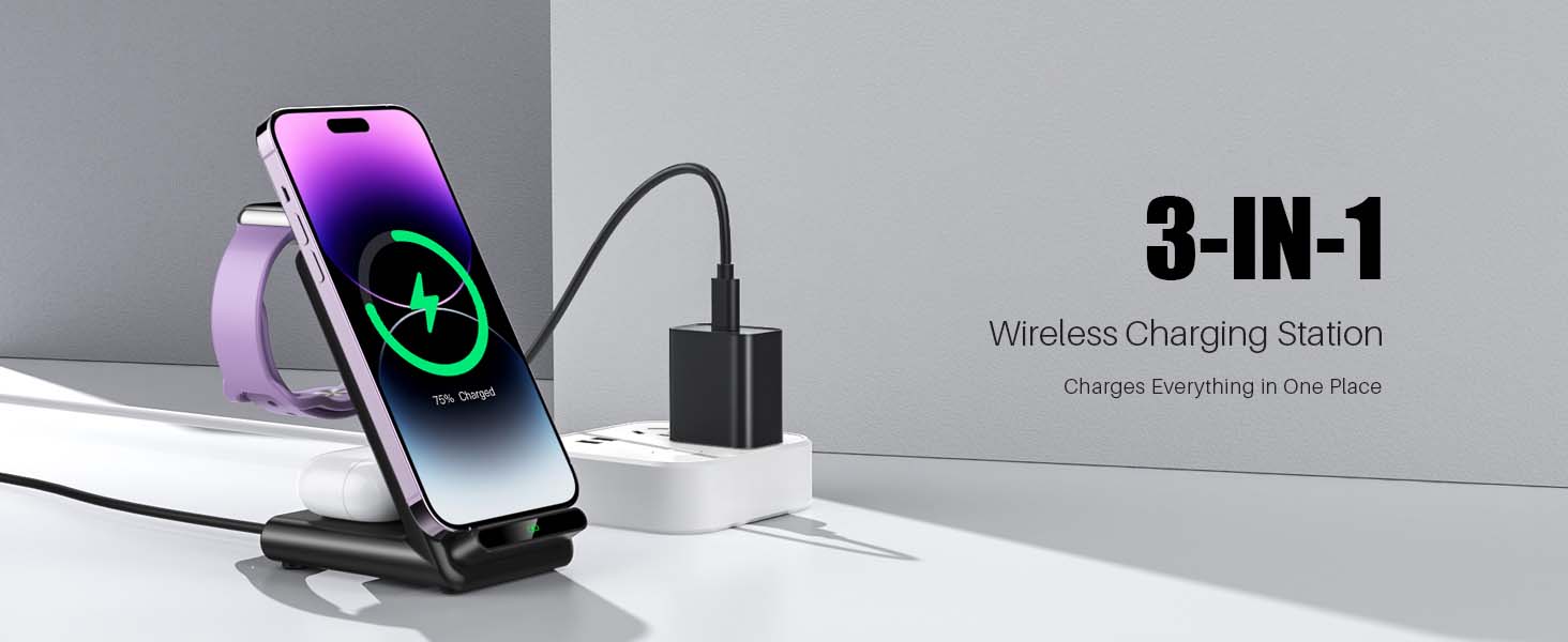 这款多功能无线充电站专为iPhone、Apple Watch和AirPods/AirPods Pro打造,您可以在一个中心位置轻松为所有日常配件充电。只需将手机放在充电座上,就可以告别纠结的电线,享受无线充电,无需再麻烦插拔。
