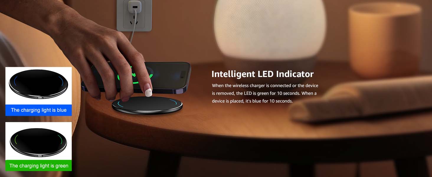 【睡眠友好的LED指示灯和安全使用】无线充电器在充电过程中会亮起蓝色10秒,然后关闭,安静地使用LED灯显示充电状态,允许不受干扰的睡眠,没有通知声音。内置过压、过温、过流、短路和其他潜在危险保护功能,可保护设备电池免受过充损坏。